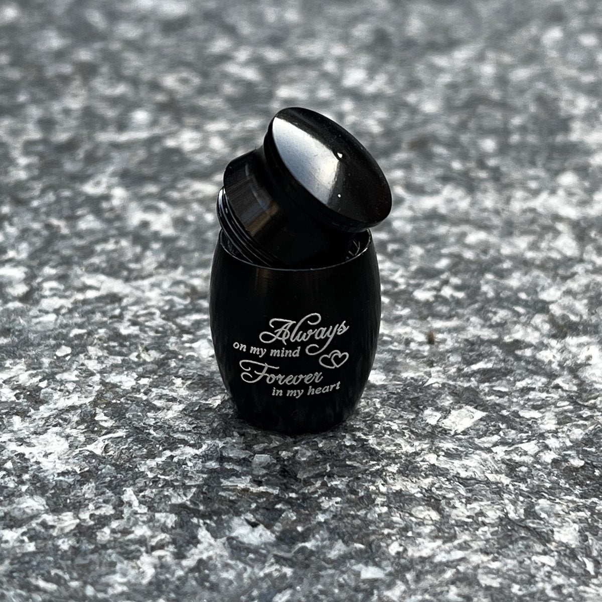 Miniurne – Schwarz – Mit Text „Always on my mind.“ Für immer in meinem Herzen‘ – Urne für Asche